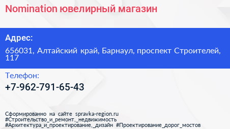 Nomination, ювелирный магазин по адресу 656031, Алтайский край, Барнаул, проспект Строителей, 117 в дальнейшем Организация, размещена в следующих категориях: