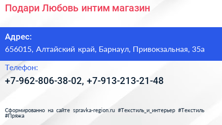 Подари Любовь, интим-магазин по адресу 656015, Алтайский край, Барнаул, Привокзальная, 35а в дальнейшем Организация, размещена в следующих категориях: