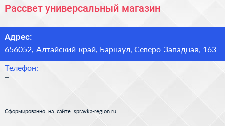 Рассвет, универсальный магазин по адресу 656052, Алтайский край, Барнаул, Северо-Западная, 163 в дальнейшем Организация, размещена в следующих категориях: