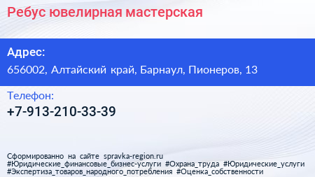 Ребус, ювелирная мастерская по адресу 656002, Алтайский край, Барнаул, Пионеров, 13 в дальнейшем Организация, размещена в следующих категориях: