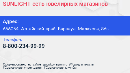 SUNLIGHT, сеть ювелирных магазинов по адресу 656054, Алтайский край, Барнаул, Малахова, 86в в дальнейшем Организация, размещена в следующих категориях: