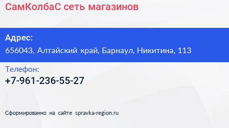 СамКолбаС, сеть магазинов по адресу 656043, Алтайский край, Барнаул, Никитина, 113 в дальнейшем Организация, размещена в следующих категориях: