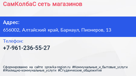 СамКолбаС, сеть магазинов по адресу 656002, Алтайский край, Барнаул, Пионеров, 13 в дальнейшем Организация, размещена в следующих категориях: