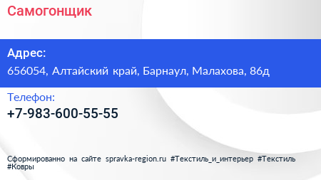 Самогонщик по адресу 656054, Алтайский край, Барнаул, Малахова, 86д в дальнейшем Организация, размещена в следующих категориях: