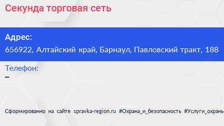 Секунда, торговая сеть по адресу 656922, Алтайский край, Барнаул, Павловский тракт, 188 в дальнейшем Организация, размещена в следующих категориях: