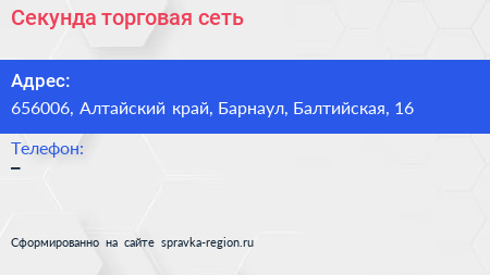 Секунда, торговая сеть по адресу 656006, Алтайский край, Барнаул, Балтийская, 16 в дальнейшем Организация, размещена в следующих категориях: