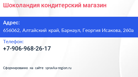 Шоколандия, кондитерский магазин по адресу 656062, Алтайский край, Барнаул, Георгия Исакова, 260а в дальнейшем Организация, размещена в следующих категориях:
