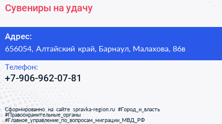 Сувениры на удачу по адресу 656054, Алтайский край, Барнаул, Малахова, 86в в дальнейшем Организация, размещена в следующих категориях: