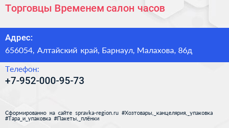 Торговцы Временем, салон часов по адресу 656054, Алтайский край, Барнаул, Малахова, 86д в дальнейшем Организация, размещена в следующих категориях: