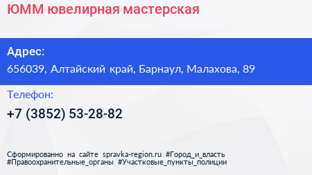 ЮММ, ювелирная мастерская по адресу 656039, Алтайский край, Барнаул, Малахова, 89 в дальнейшем Организация, размещена в следующих категориях: