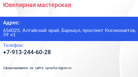 Ювелирная мастерская по адресу 656023, Алтайский край, Барнаул, проспект Космонавтов, 59 к1 в дальнейшем Организация, размещена в следующих категориях: