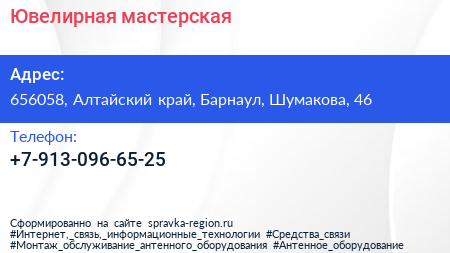 Ювелирная мастерская по адресу 656058, Алтайский край, Барнаул, Шумакова, 46 в дальнейшем Организация, размещена в следующих категориях: