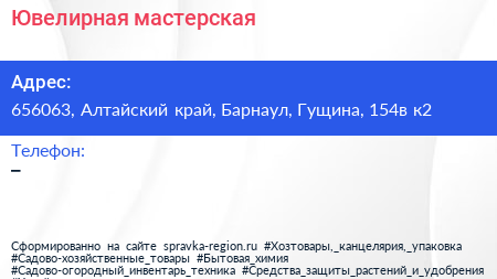 Ювелирная мастерская по адресу 656063, Алтайский край, Барнаул, Гущина, 154в к2 в дальнейшем Организация, размещена в следующих категориях: