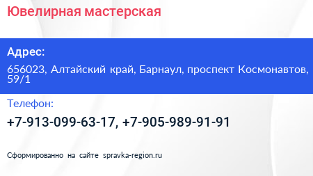 Ювелирная мастерская по адресу 656023, Алтайский край, Барнаул, проспект Космонавтов, 59/1 в дальнейшем Организация, размещена в следующих категориях: