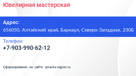 Ювелирная мастерская по адресу 656050, Алтайский край, Барнаул, Северо-Западная, 230Б в дальнейшем Организация, размещена в следующих категориях: