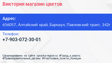 Виктория, магазин цветов по адресу 656057, Алтайский край, Барнаул, Павловский тракт, 142г в дальнейшем Организация, размещена в следующих категориях:
