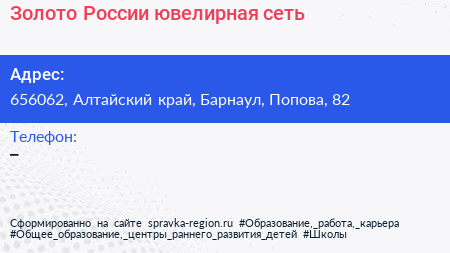 Золото России, ювелирная сеть по адресу 656062, Алтайский край, Барнаул, Попова, 82 в дальнейшем Организация, размещена в следующих категориях: