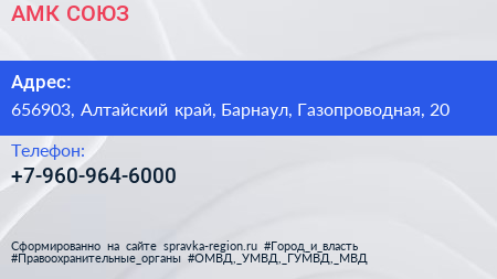 АМК-СОЮЗ по адресу 656903, Алтайский край, Барнаул, Газопроводная, 20 в дальнейшем Организация, размещена в следующих категориях: