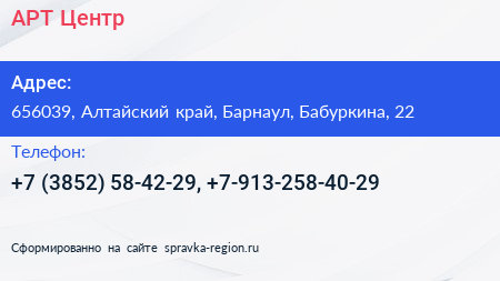 АРТ-Центр по адресу 656039, Алтайский край, Барнаул, Бабуркина, 22 в дальнейшем Организация, размещена в следующих категориях: