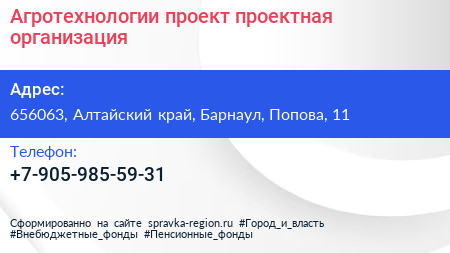 Агротехнологии-проект, проектная организация по адресу 656063, Алтайский край, Барнаул, Попова, 11 в дальнейшем Организация, размещена в следующих категориях: