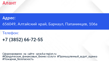 Алант по адресу 656049, Алтайский край, Барнаул, Папанинцев, 106а в дальнейшем Организация, размещена в следующих категориях: