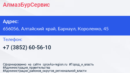 АлмазБурСервис по адресу 656056, Алтайский край, Барнаул, Короленко, 45 в дальнейшем Организация, размещена в следующих категориях: