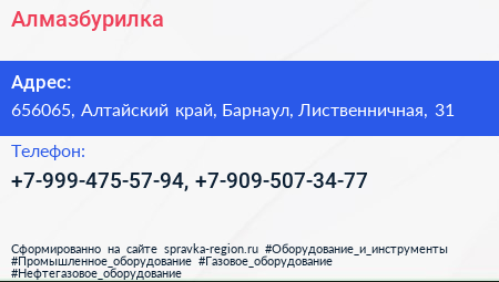 Алмазбурилка по адресу 656065, Алтайский край, Барнаул, Лиственничная, 31 в дальнейшем Организация, размещена в следующих категориях: