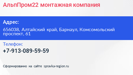 АльпПром22, монтажная компания по адресу 656038, Алтайский край, Барнаул, Комсомольский проспект, 61 в дальнейшем Организация, размещена в следующих категориях: