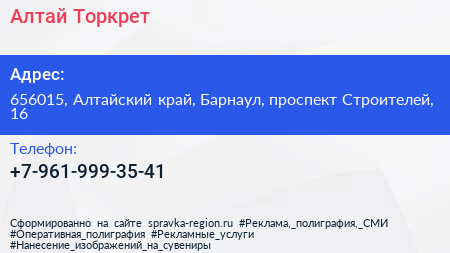 Алтай Торкрет по адресу 656015, Алтайский край, Барнаул, проспект Строителей, 16 в дальнейшем Организация, размещена в следующих категориях: