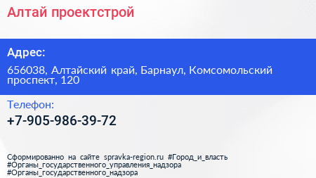 Алтай-проектстрой по адресу 656038, Алтайский край, Барнаул, Комсомольский проспект, 120 в дальнейшем Организация, размещена в следующих категориях: