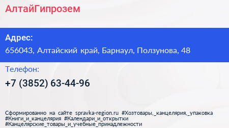 АлтайГипрозем по адресу 656043, Алтайский край, Барнаул, Ползунова, 48 в дальнейшем Организация, размещена в следующих категориях: