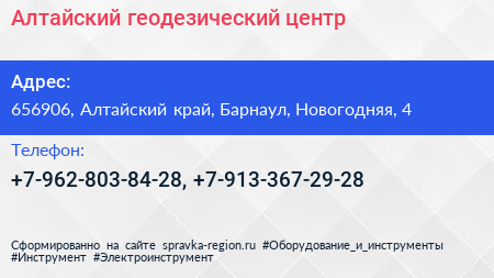 Алтайский геодезический центр по адресу 656906, Алтайский край, Барнаул, Новогодняя, 4 в дальнейшем Организация, размещена в следующих категориях: