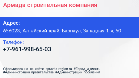 Армада, строительная компания по адресу 656023, Алтайский край, Барнаул, Западная 1-я, 50 в дальнейшем Организация, размещена в следующих категориях: