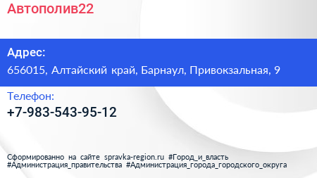 Автополив22 по адресу 656015, Алтайский край, Барнаул, Привокзальная, 9 в дальнейшем Организация, размещена в следующих категориях: