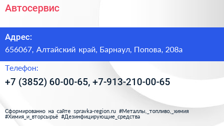Автосервис по адресу 656067, Алтайский край, Барнаул, Попова, 208а в дальнейшем Организация, размещена в следующих категориях: