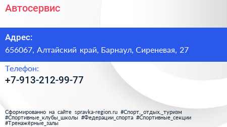 Автосервис по адресу 656067, Алтайский край, Барнаул, Сиреневая, 27 в дальнейшем Организация, размещена в следующих категориях: