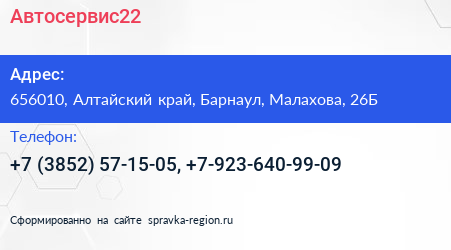 Автосервис22 по адресу 656010, Алтайский край, Барнаул, Малахова, 26Б в дальнейшем Организация, размещена в следующих категориях: