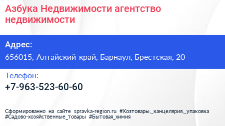 Азбука Недвижимости, агентство недвижимости по адресу 656015, Алтайский край, Барнаул, Брестская, 20 в дальнейшем Организация, размещена в следующих категориях: