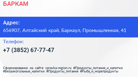 БАРКАМ по адресу 656907, Алтайский край, Барнаул, Промышленная, 41 в дальнейшем Организация, размещена в следующих категориях: