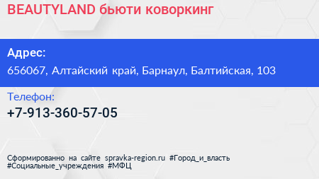 BEAUTYLAND, бьюти-коворкинг по адресу 656067, Алтайский край, Барнаул, Балтийская, 103 в дальнейшем Организация, размещена в следующих категориях: