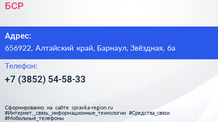 БСР по адресу 656922, Алтайский край, Барнаул, Звёздная, 6а в дальнейшем Организация, размещена в следующих категориях: