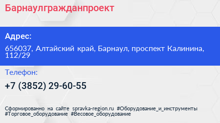 Барнаулгражданпроект по адресу 656037, Алтайский край, Барнаул, проспект Калинина, 112/29 в дальнейшем Организация, размещена в следующих категориях: