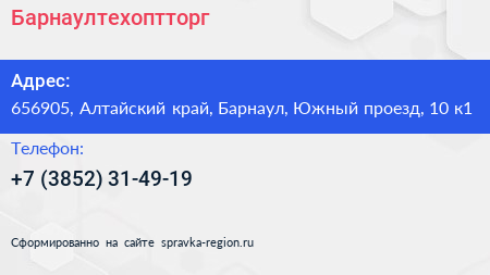 Барнаултехоптторг по адресу 656905, Алтайский край, Барнаул, Южный проезд, 10 к1 в дальнейшем Организация, размещена в следующих категориях: