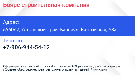 Бояре, строительная компания по адресу 656067, Алтайский край, Барнаул, Балтийская, 68а в дальнейшем Организация, размещена в следующих категориях: