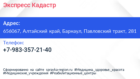 Экспресс Кадастр по адресу 656067, Алтайский край, Барнаул, Павловский тракт, 281 в дальнейшем Организация, размещена в следующих категориях: