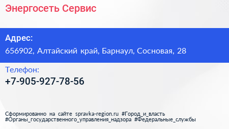 Энергосеть-Сервис по адресу 656902, Алтайский край, Барнаул, Сосновая, 28 в дальнейшем Организация, размещена в следующих категориях: