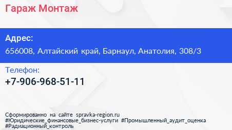 Гараж-Монтаж по адресу 656008, Алтайский край, Барнаул, Анатолия, 308/3 в дальнейшем Организация, размещена в следующих категориях: