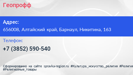 Геопрофф по адресу 656008, Алтайский край, Барнаул, Никитина, 163 в дальнейшем Организация, размещена в следующих категориях: