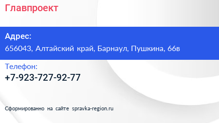 Главпроект по адресу 656043, Алтайский край, Барнаул, Пушкина, 66в в дальнейшем Организация, размещена в следующих категориях: