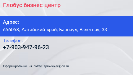 Глобус, бизнес-центр по адресу 656058, Алтайский край, Барнаул, Взлётная, 33 в дальнейшем Организация, размещена в следующих категориях: